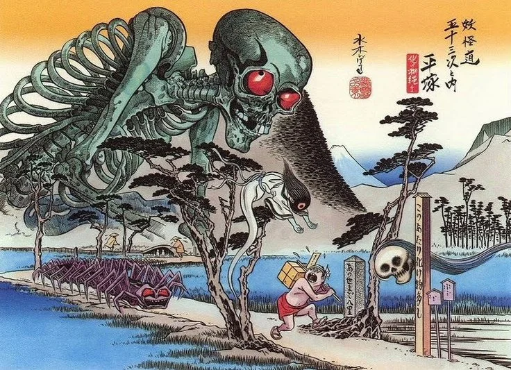 Japanese Yokai (demons if you will) are filled with the bizarre and horrifying. The Gashadokuro doesn’t top my personal list, but it has some rich features and backstory that are worth a look. To begin–this is a 90 foot skeleton that roams around at 2AM eating people, more or less. As a mythological creature, its story and features change over time, retelling, and region.